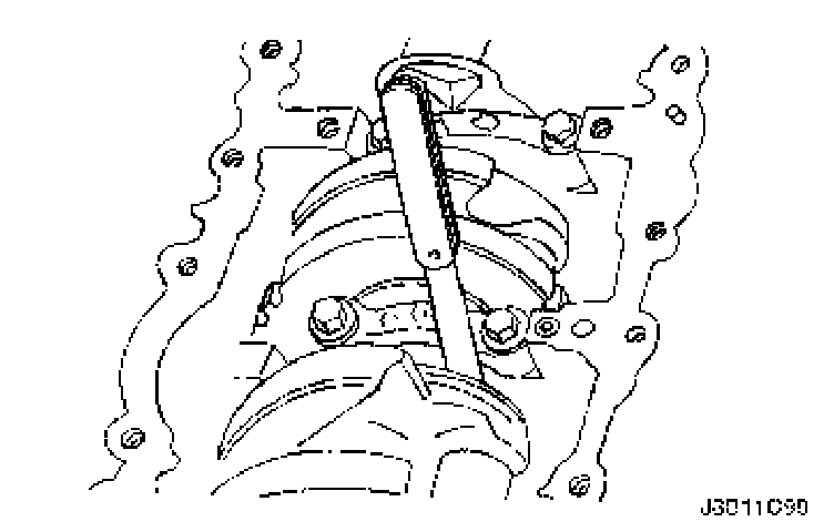 8. Inspect all of the crankshaft bearing clearances using a commercially available plastic gauging (ductile plastic threads).