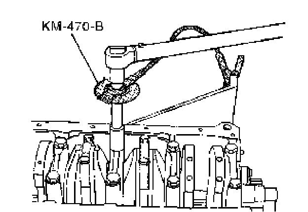 Tighten: Tighten the crankshaft bearing cap bolts to 50 Nm (37 ft. lbs.) using a torque wrench. Use the angular torque gauge KM-470-B to tighten the crankshaft bearings another 45° and 15°.