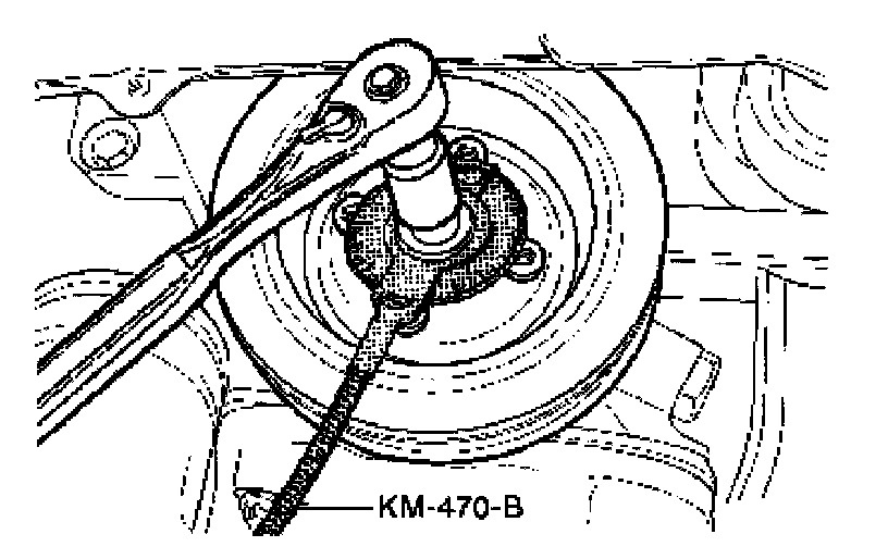 Tighten: Tighten the flywheel bolts to 65 Nm (48 ft. lbs.). Use the angular torque gauge KM-470-B to tighten the flywheel bolts another 30° plus 15°. For the automatic transmission, tighten the flexible plate bolts to 45 Nm (33 ft. lbs.).