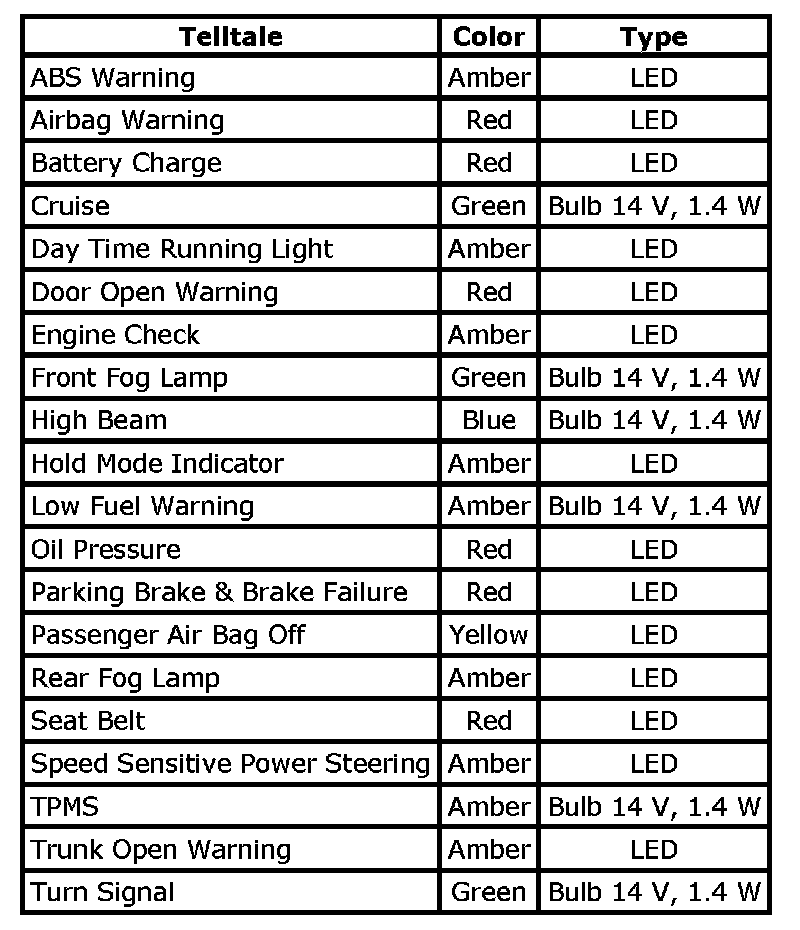 Instrument Cluster Indicator Lamps Specifications: