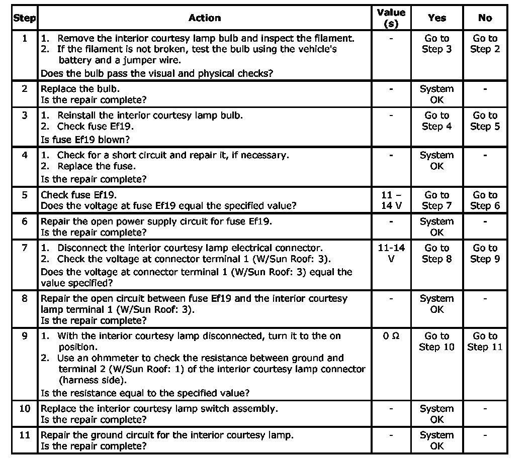 Interior Courtesy Lamp InoperativeWARNING: Always make sure there is an electrical load (lamp bulb, etc.) in any circuit between battery terminals. Do not make a short circuit between battery terminals with a jumper wire. Hazardous sparking would