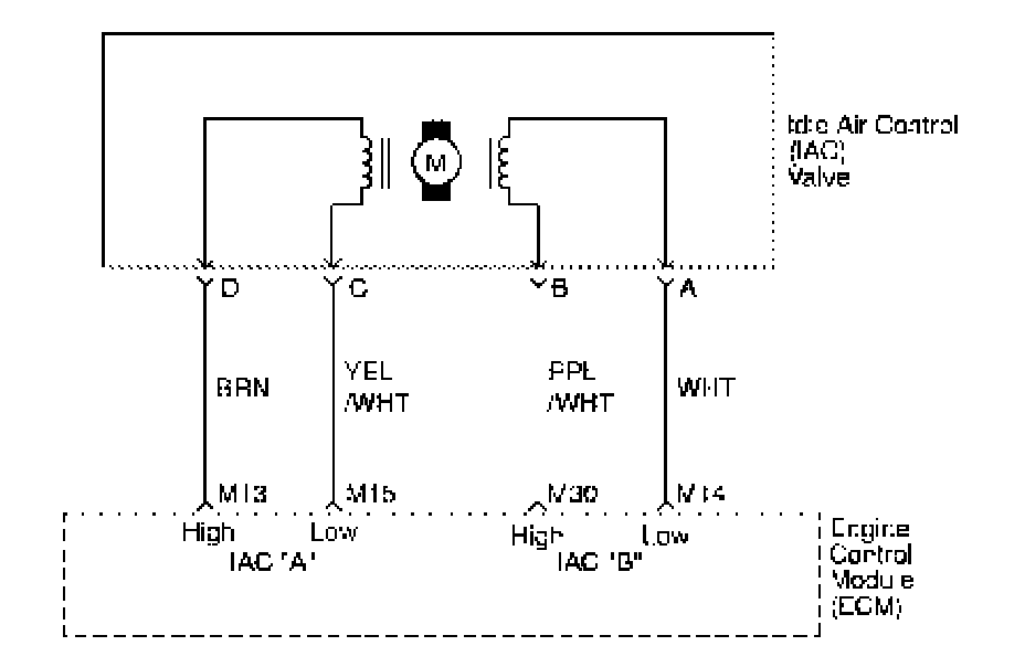 2. The IAC valve is extended and retracted by the IAC driver. IAC valve movement is verified by an engine speed change. If no change in engine speed occurs, the valve can be removed from the throttle body and tested. Connect the IAC driver to the removed IAC valve and turn the ignition ON. Do not start the engine.