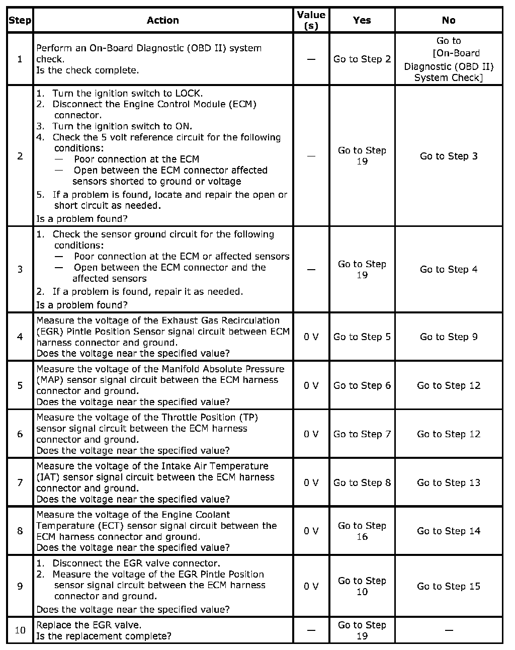 3. If a sensor input circuit has been shorted to voltage, ensure that the sensor has not been damaged. A damaged IAT or ECT sensor will continue to indicate a high voltage or low temperature after the affected circuit has been repaired. A damaged ACT, TP, MAP, Fuel Tank Pressure, or EGR Pintle Position sensor will indicate a high or low voltage or may be stuck at a fixed value after the affected circuit has been repaired. If the sensor has been damaged, replace it.