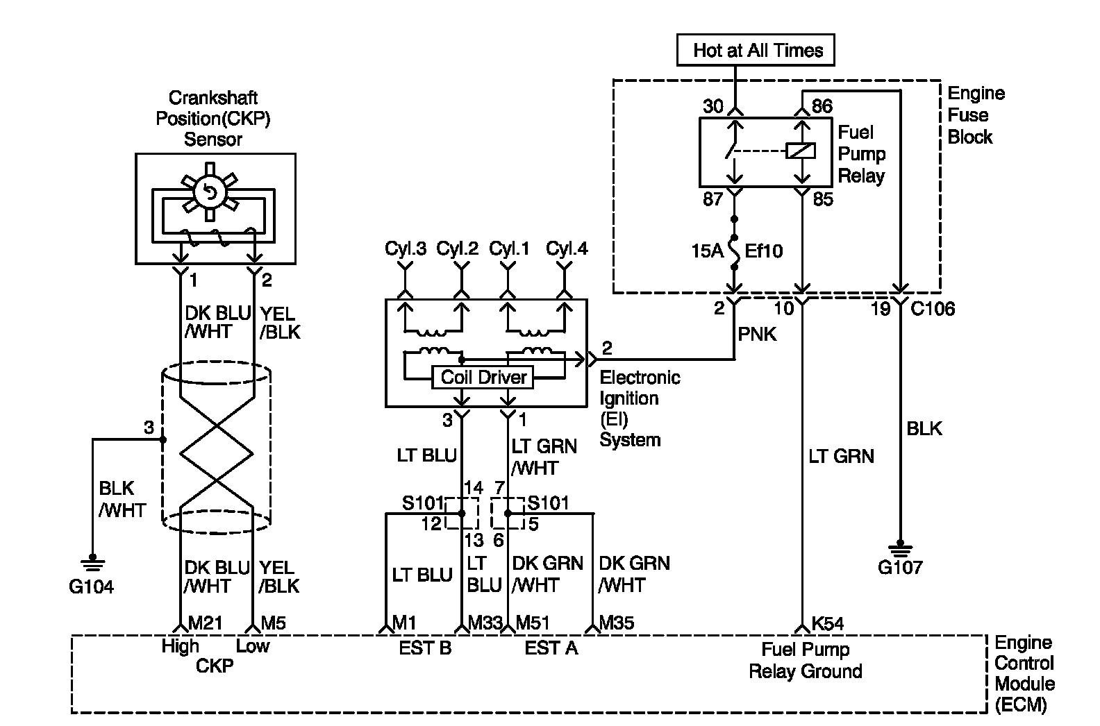 The Electronic Ignition (EI) system uses a waste spark method of spark distribution. In this type of EI system, the Crankshaft Position (CKP) sensor is mounted to the oil pump near a slotted wheel that is a part of the crankshaft pulley. The CKP sensor sends reference pulses to the Engine Control Module (ECM). The ECM then triggers the EI system ignition coil. Once the ECM triggers the EI system ignition coil, both of the connected spark plugs fire at the same time. One cylinder is on its compression stroke at the same time that the other is on the exhaust stroke, resulting in lower energy needed to fire the spark plug in the cylinder on its exhaust stroke. This leaves the remainder of the high voltage to be used to fire the spark plug in the cylinder on its compression stroke. Since the CKP sensor is in a fixed position, timing adjustments are not possible or needed.