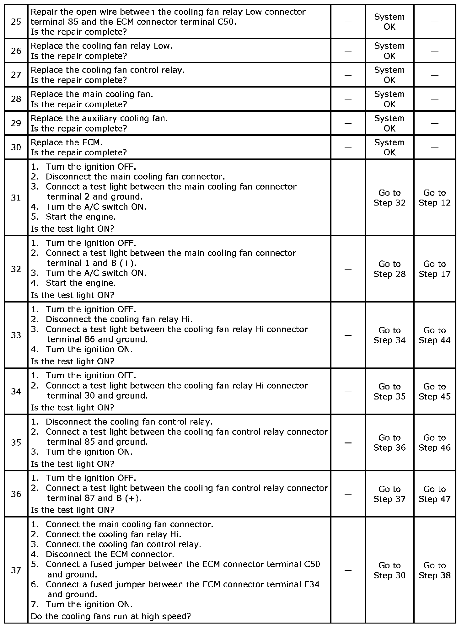 ^ The cooling fan circuit can be checked quickly by disconnecting the ECM connector 2 and grounding the connector terminal C50. This should create low speed cooling fan operation with the ignition ON. By grounding the ECM connector terminals C50 and E34 and turning the ignition ON, high speed cooling fan operation should be achieved.