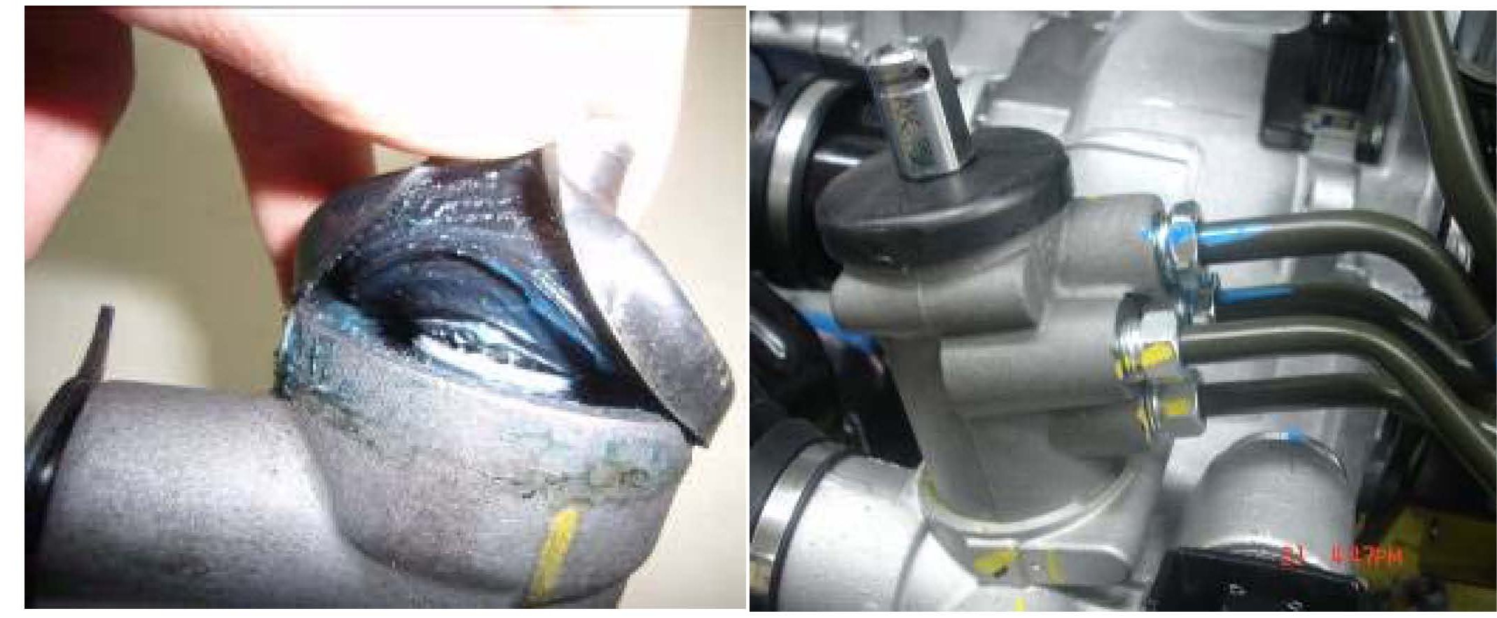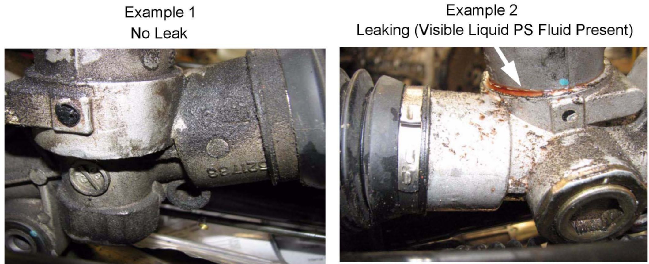 9. Any area which is coated with dust is not considered a leak. Dust accumulation is most likely caused from assembly lubricant, or oil spill from passed work performed on the vehicle. (See example 1) A leak will not accumulate dust due to the fluid leak washing away dust as it accumulate. (See example 2).