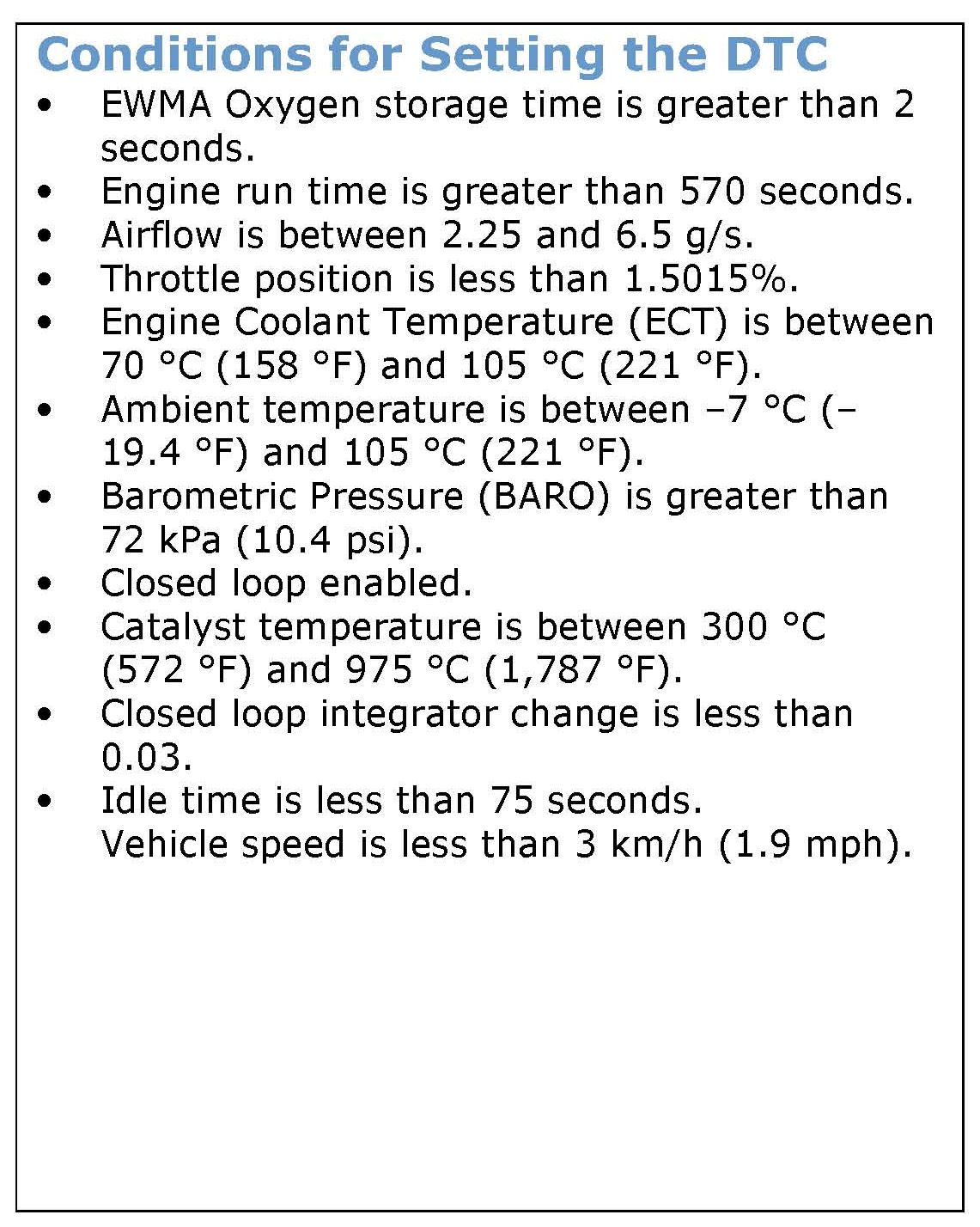 2. Familiarize yourself with the "Conditions for Setting the DTC" which must be met for the system to set the DTC (shown at the right").