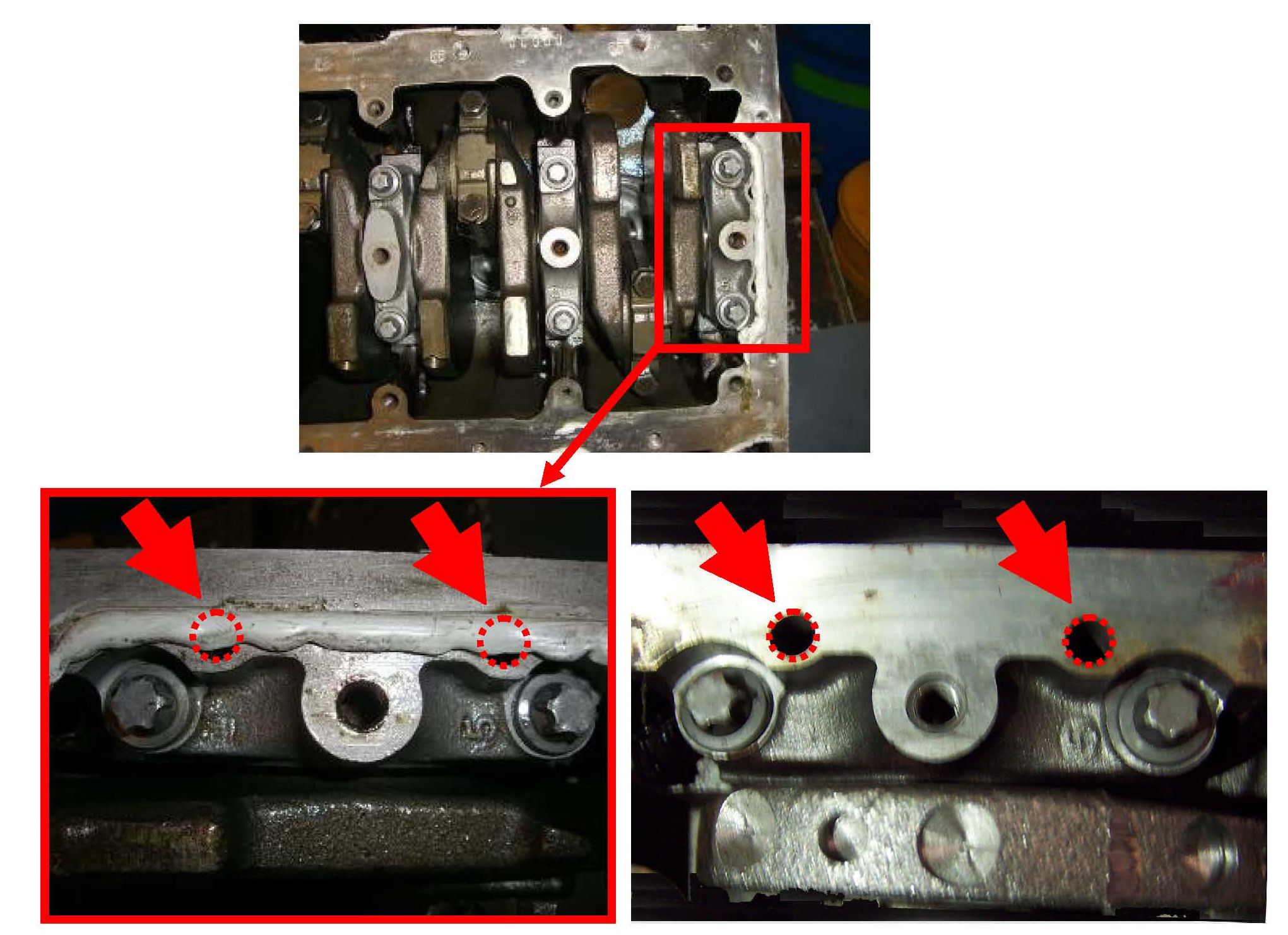3. When installing an oil pan on a Forenza motor, inspect these passages pictured below to ensure that they are clean and clear of any debris before the pan goes into place.
