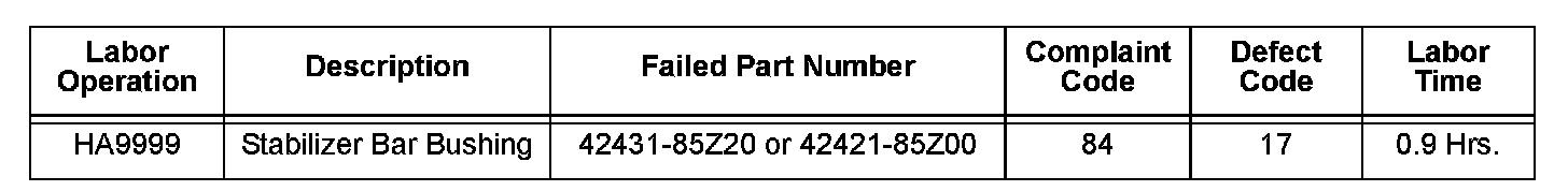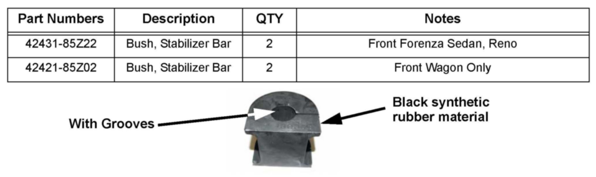 To address the above condition a new stabilizer bar bushing is now available. Replace the bushing of the affected vehicle with the part number listed below. Follow the appropriate Service Manual procedure. Be sure to clean any grease oft of the stabilizer bar that may be present before installing the new bushings. Replacement of the stabilizer bar is not necessary nor recommended.