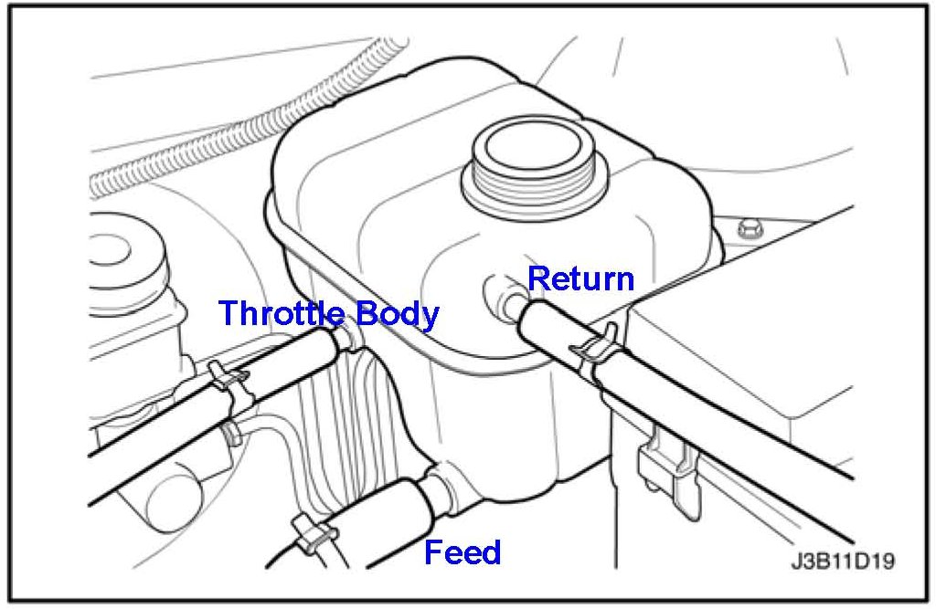 4. Loosen the return hose clamp and disconnect the return hose from the top of the surge tank.