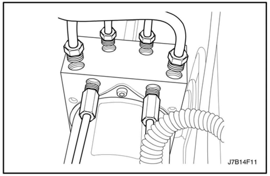 7. Connect the brake pipes to the ABS Hydraulic Modulator in the same positions noted when removed. Tighten each brake pipe fitting.