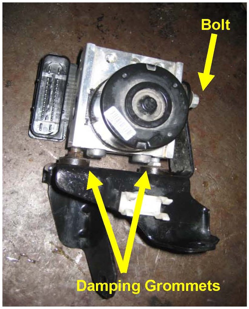 16. Remove the ABS modulator assembly bracket bolt, then remove the ABS module from the bracket by sliding it out from the two damping grommets.