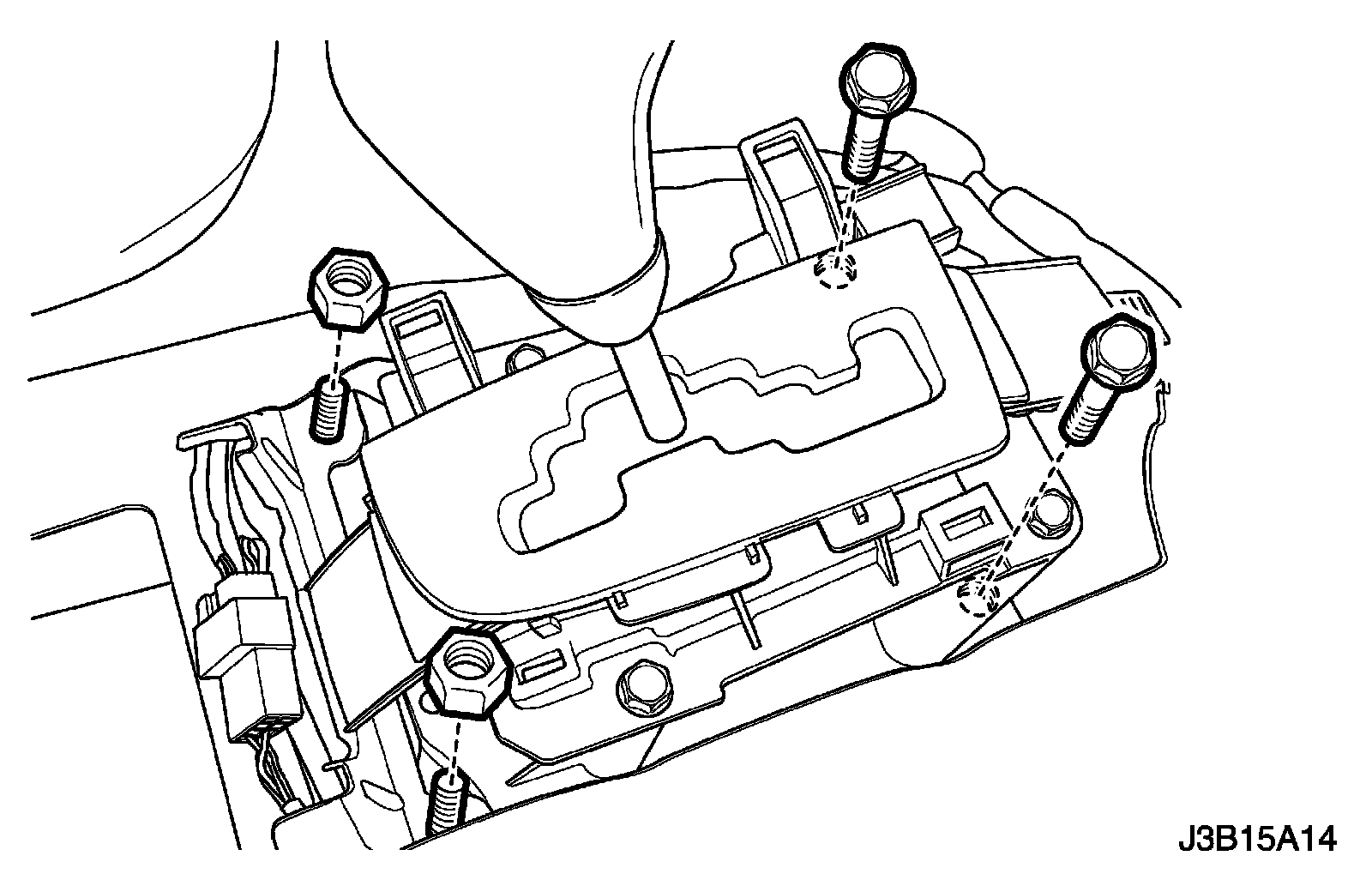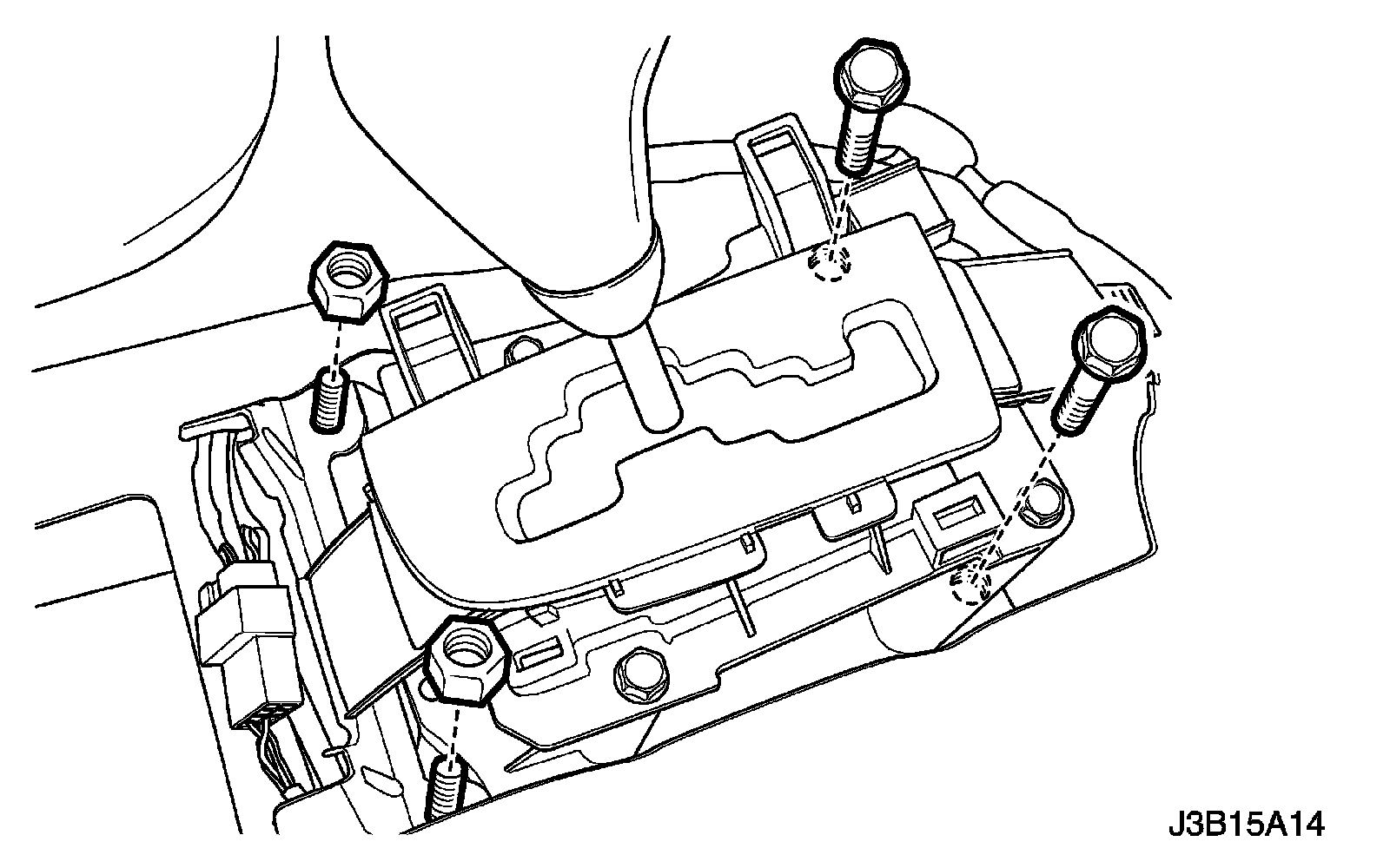 6. Remove the bolts and nuts holding the shift control assembly to the floor panel.