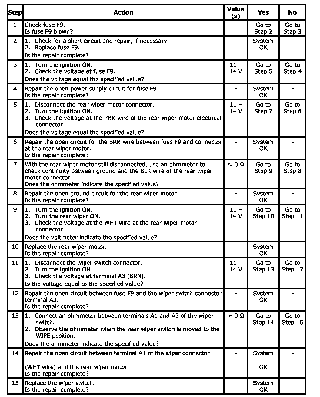 If the front wiper is operating correctly, begin the diagnostic table at Step 5. It would not be necessary to check the fuse or power supply circuit.