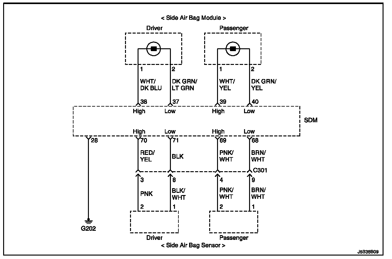 ^ The side airbag sensor wiring of driver's high is shorted to ground.