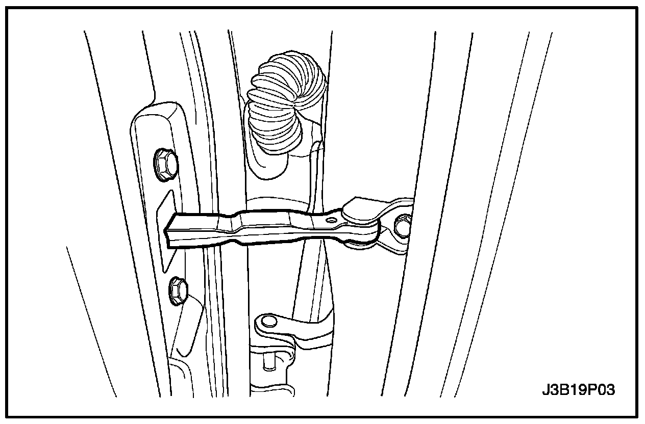 1. Remove the door hold-open link-to-body bolt and the door hold-open link.