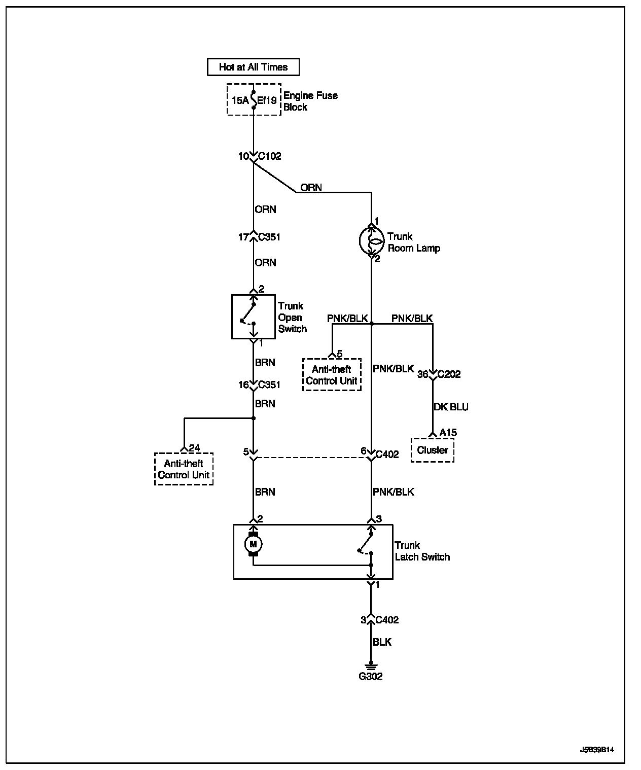 Trunk/Tail Gate Open Switch, Trunk Latch Switch and Trunk Room Lamps Circuit Diagram (For NOTCHBACK Model)
