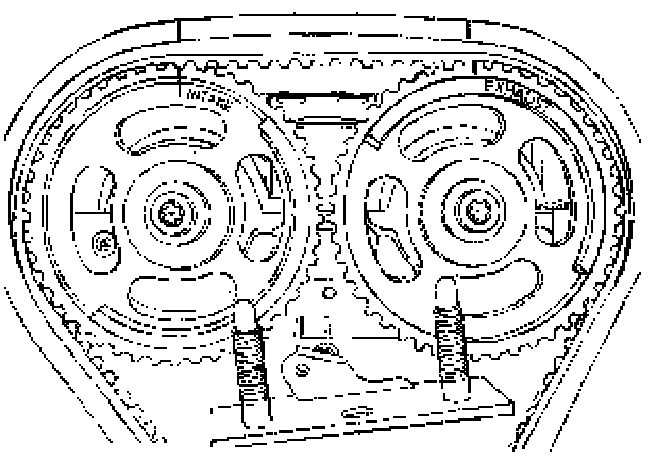 41. Align the timing marks on the camshaft gears to the notches on the camshaft cover, using the intake gear mark for the intake gear and the exhaust gear mark for the exhaust gear.