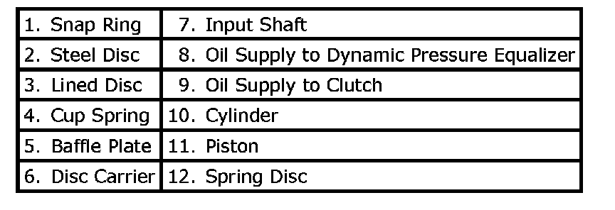 The shift elements are engaged hydraulically. The pressurized oil reaches the space between the cylinder and piston, as a result the discs are compressed. The clutch/brake is engaged when the oil pressure drops, the cup spring acting on the piston presses the piston back into its initial position. The clutch/brake is now released again.