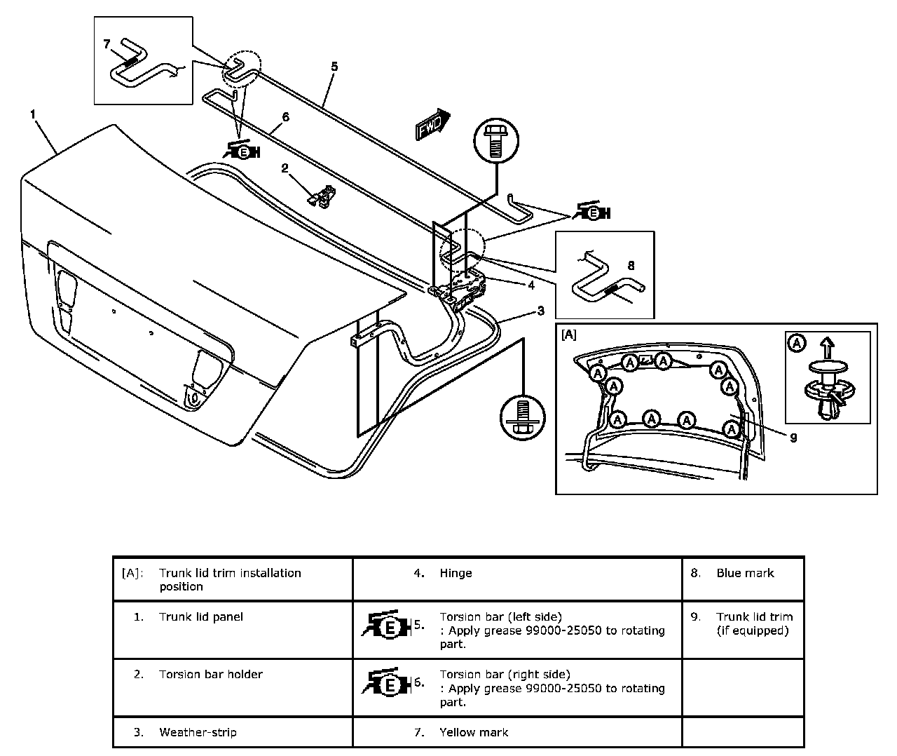 TRUNK LID REMOVAL AND INSTALLATION (SEDAN MODEL)Trunk Lid Components (Sedan Model):