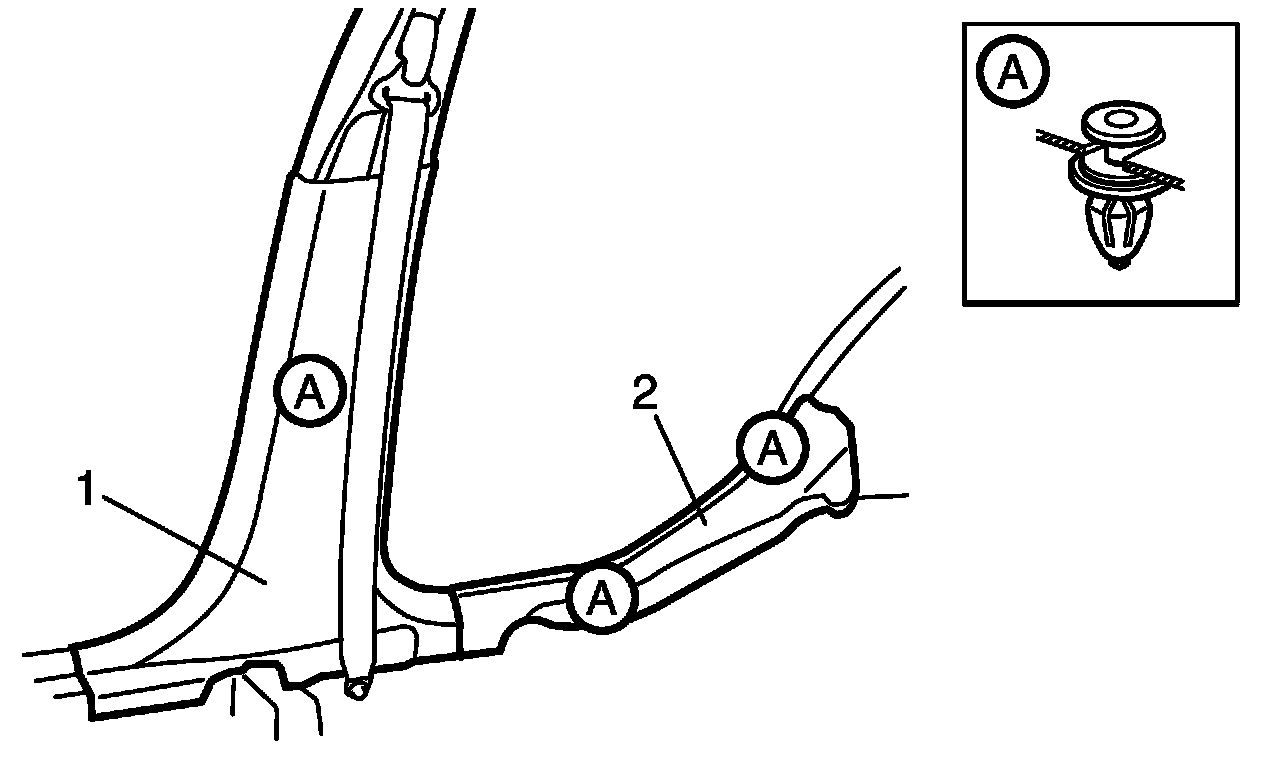 6. Remove center pillar inner lower trims (1) and side sill scuffs (2).