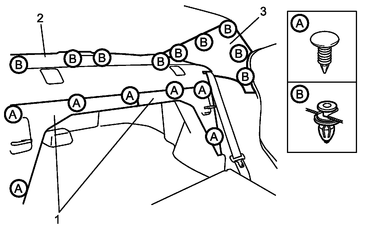 10. Remove rear pillar inner trims (3), partition front trims (if equipped) (1) and partition trim (2).