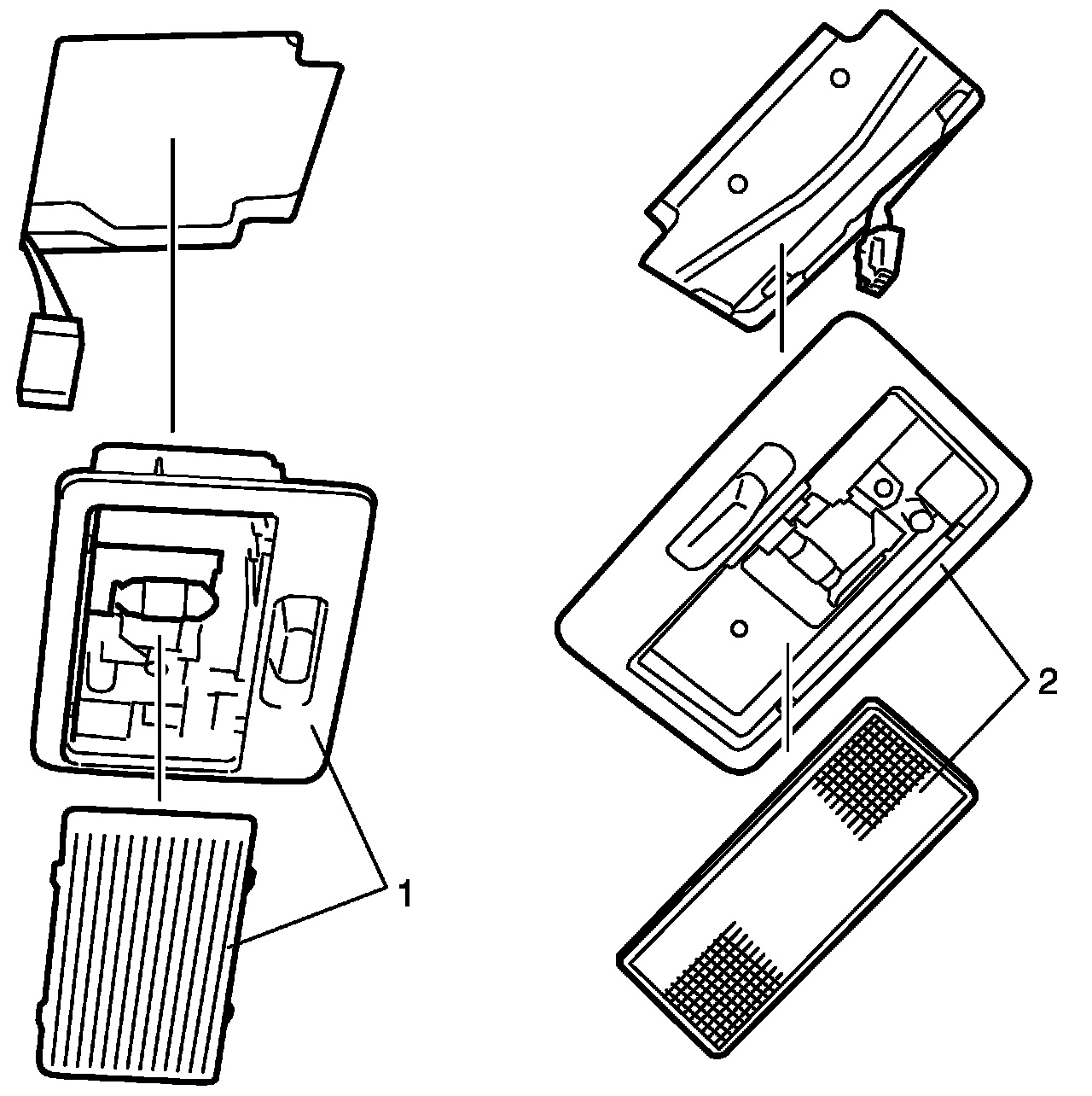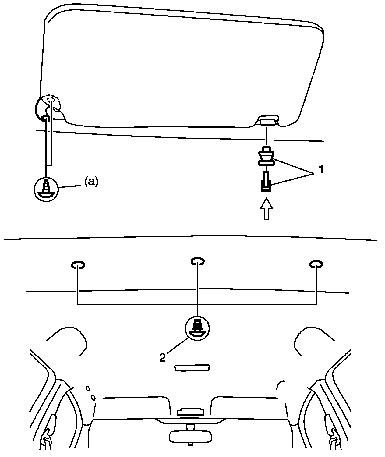 ^ Fix sun visor clip (1) first and adjust head lining in position and fix three clips (2) at rear end.
