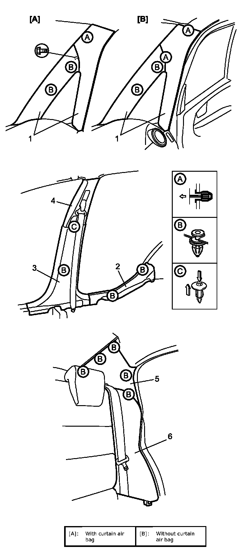 4. For sedan model, remove front pillar upper trims (1), center pillar inner lower trims (3), rear side sill scuffs (2), center pillar upper trims (4), side backs (separate seat model) (6), seat cushion (bench seat model), seat back (bench seat model) and rear pillar inner trims (5).
