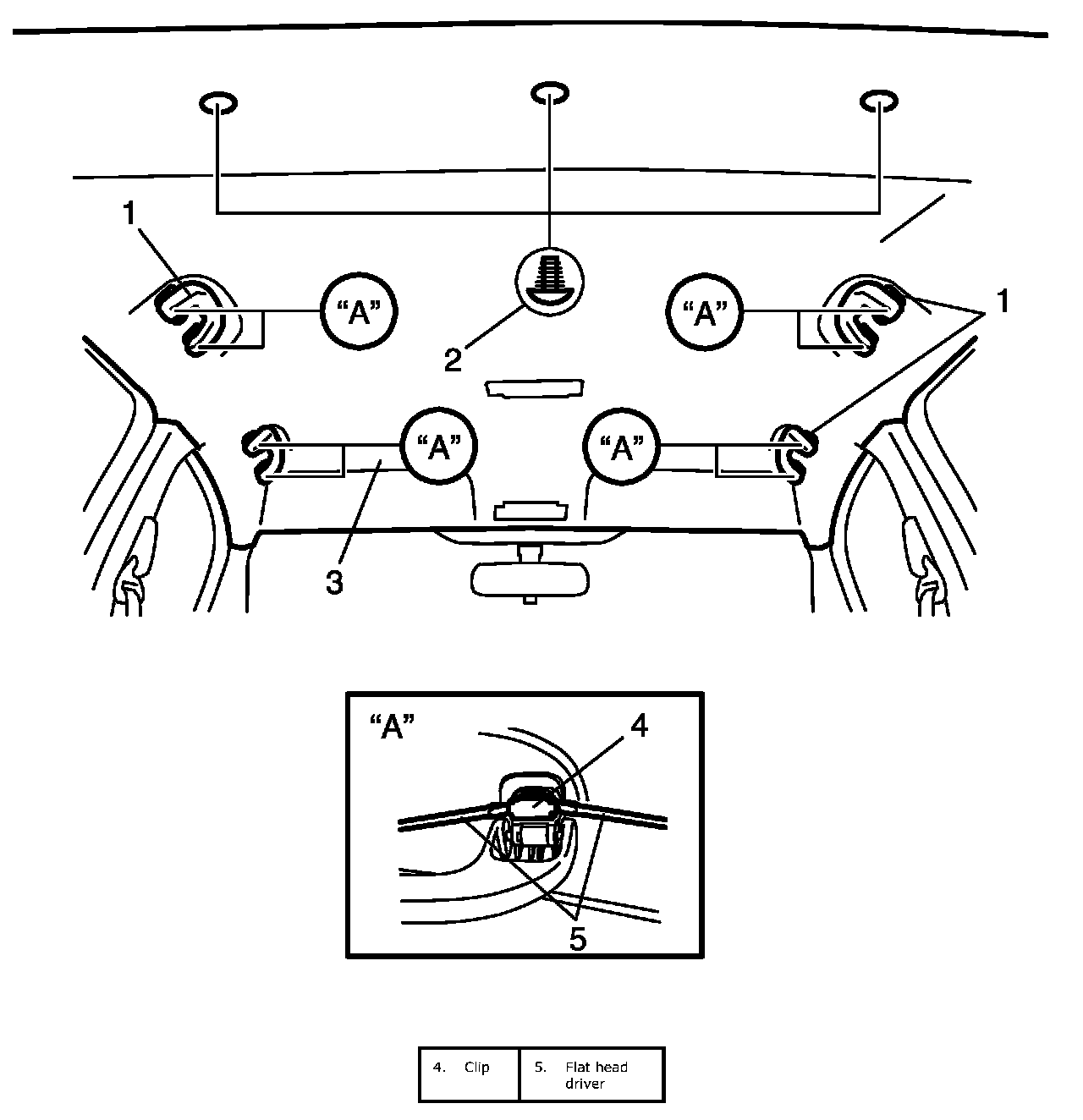 6. Remove head lining clips (2) at rear end and remove head lining (3).