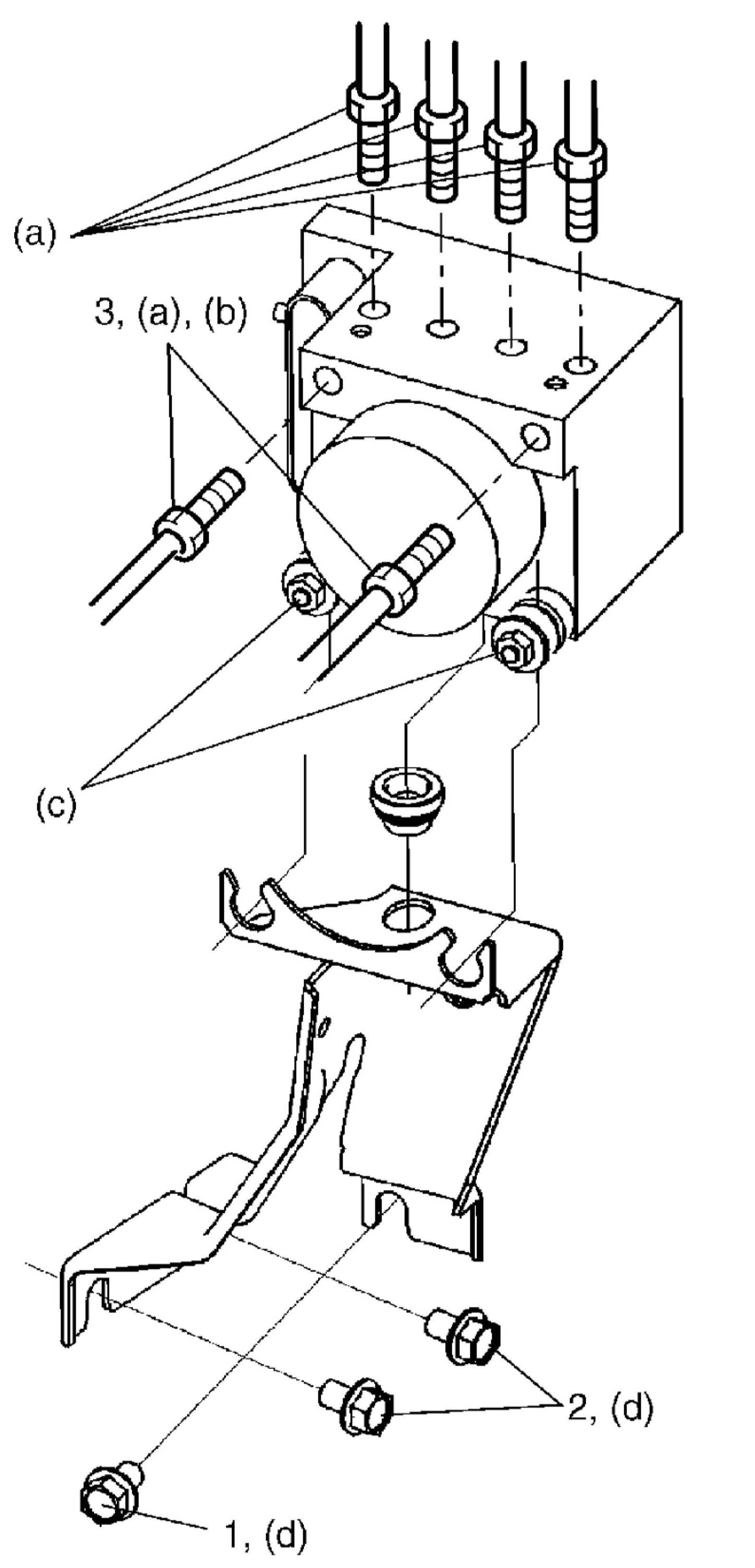 5. Remove bolt and pull out ABS hydraulic unit / control module assembly (1) from bracket (3) using flat end rod or the like (2).