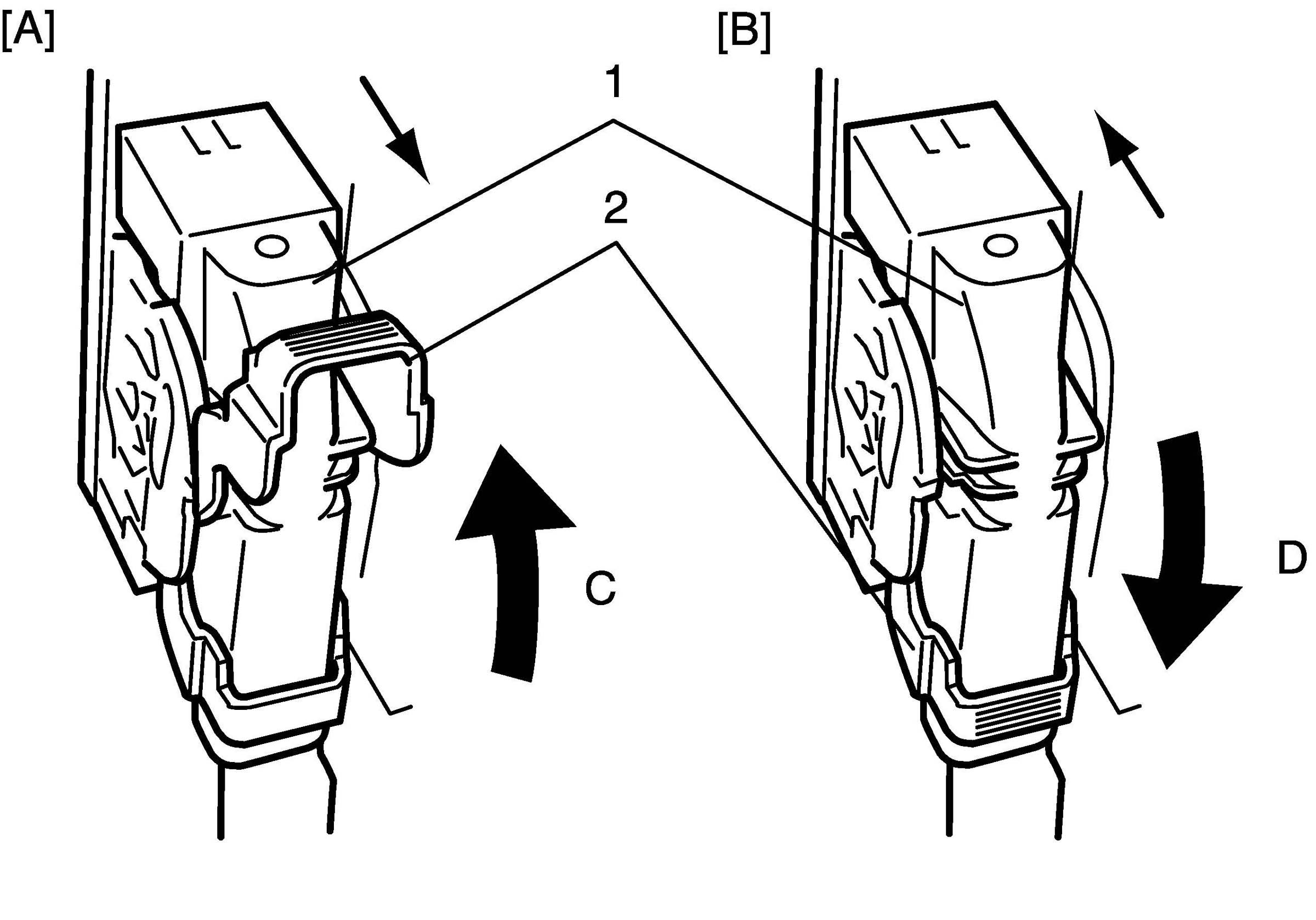 ^ When disconnecting ESP(R) control module connector (1), pull up the lock lever (2) of connector.
