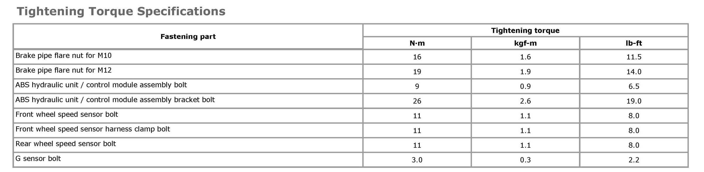 Tightening Torque Specifications