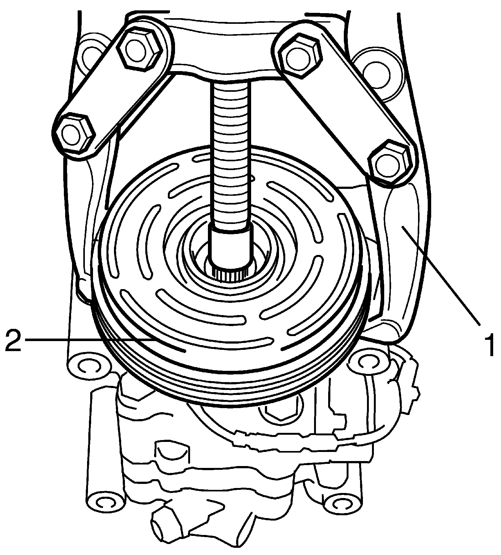 ^ If it is difficult to remove magnet clutch pulley by hand, use puller (1).