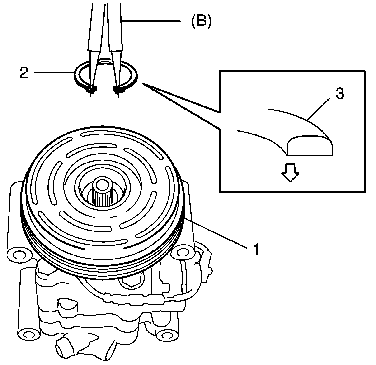 7. Adjust clearance between armature plate (1) and magnet clutch pulley by putting shim(s) on compressor shaft. To measure the clearance, perform the following steps.