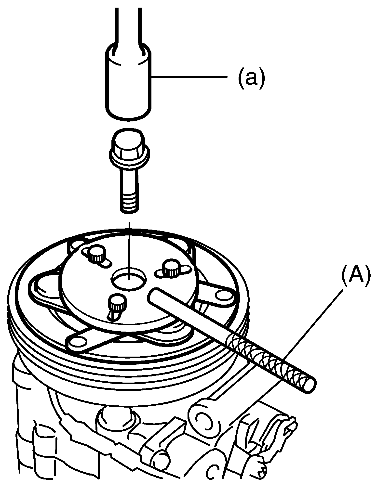 d. Connect battery negative terminal (-) to compressor body assembly. (At this point, armature plate and magnet clutch pulley are kept in contact.)