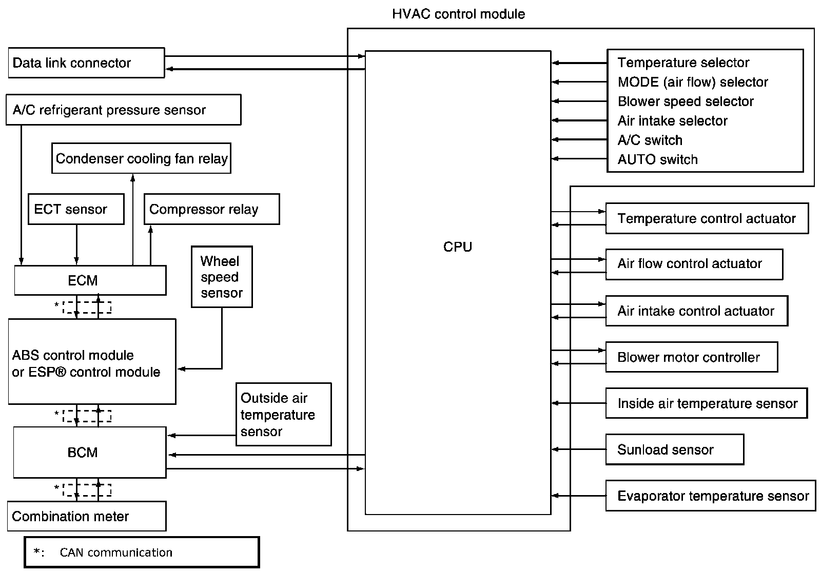 Auto A/C System DescriptionThe automatic type air conditioning system (auto A/C) is provided with the function to automatically control the inside air temperature, fan speed, air flow outlet direction and air intake position by HVAC control module in addition to functions of the manual type air conditioning system (manual A/C). Once the inside air temperature is set using the temperature selector, HVAC control module automatically controls the inside air temperature at the constant level at all times based on the inside air temperature, outside air temperature, amount of sunlight and engine coolant temperature detected respectively by the inside air temperature sensor, outside air temperature sensor, sunload sensor and ECT sensor. For the electronic control system components location, refer to Electronic Control System Components Location:Manual Type. For the A/C system components location, refer to A/C System Major Components Location:Automatic Type.