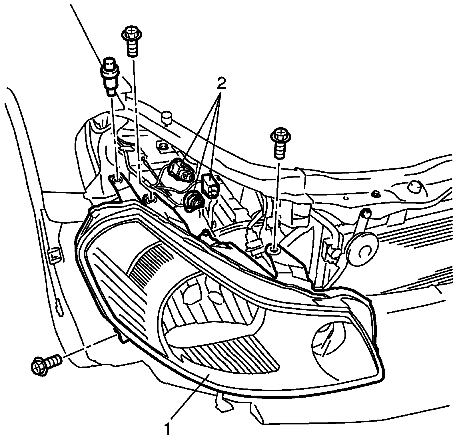 ^ Install headlight mounting bolts and clip (1), and then tighten headlight mounting bolts ("1"-"2") according to numerical order as shown in figure.
