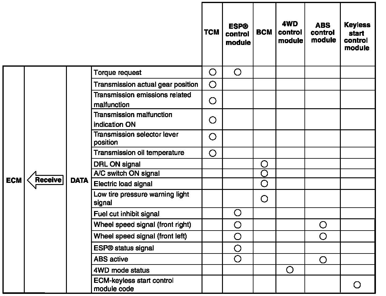 CAN communication system uses the serial communication in which data is transmitted at a high speed. It uses a twisted pair of two communication lines for the high-speed data transmission. As one of its characteristics, multiple control modules can communicate simultaneously. In addition, it has a function to detect a communication error automatically. Each module reads necessary data from the received data and transmits data. ECM communicates control data with each control module as follows.