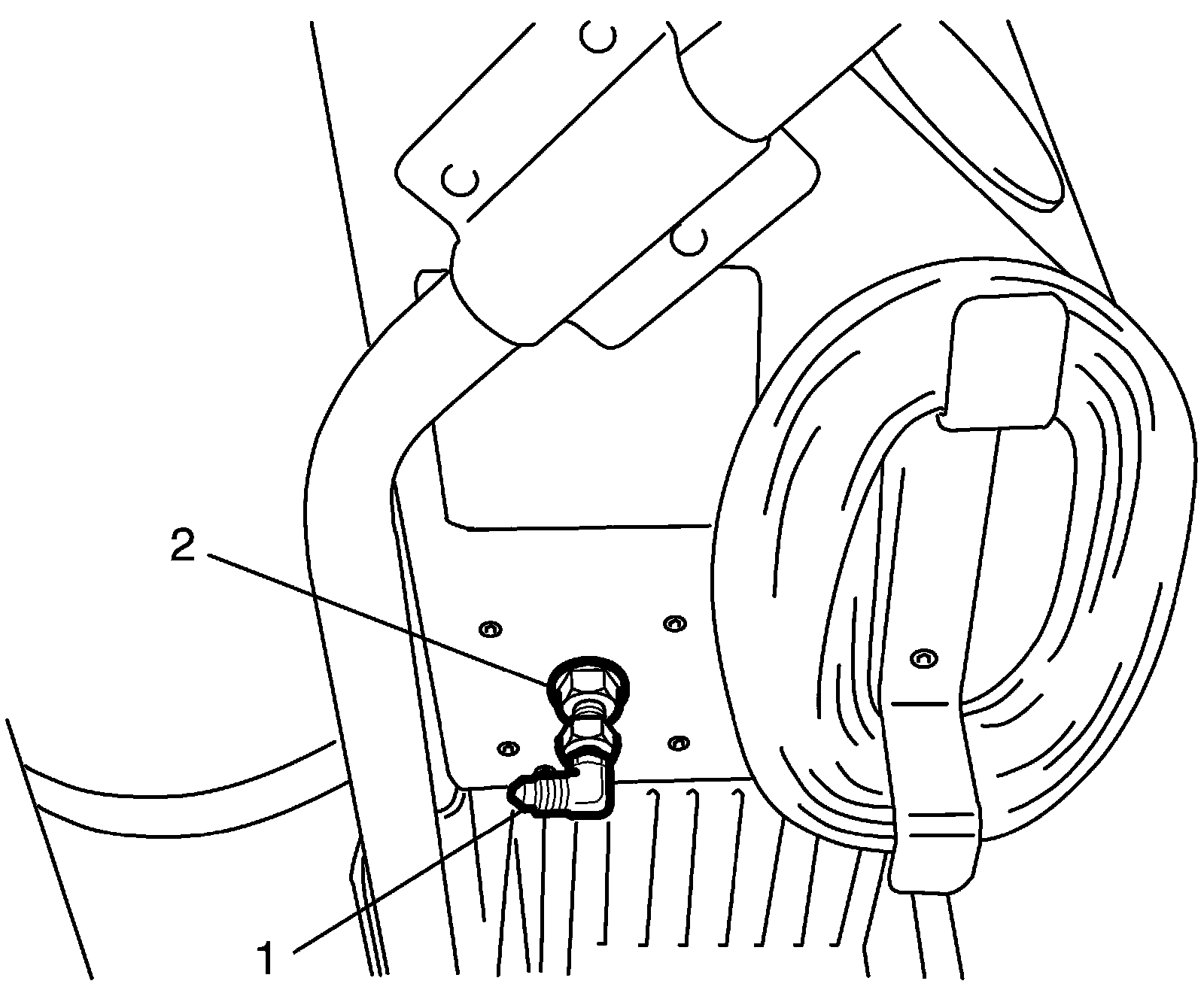 8. Install the 90 ° adapter (1) onto the nitrogen inlet (2) on the left side of the tester.