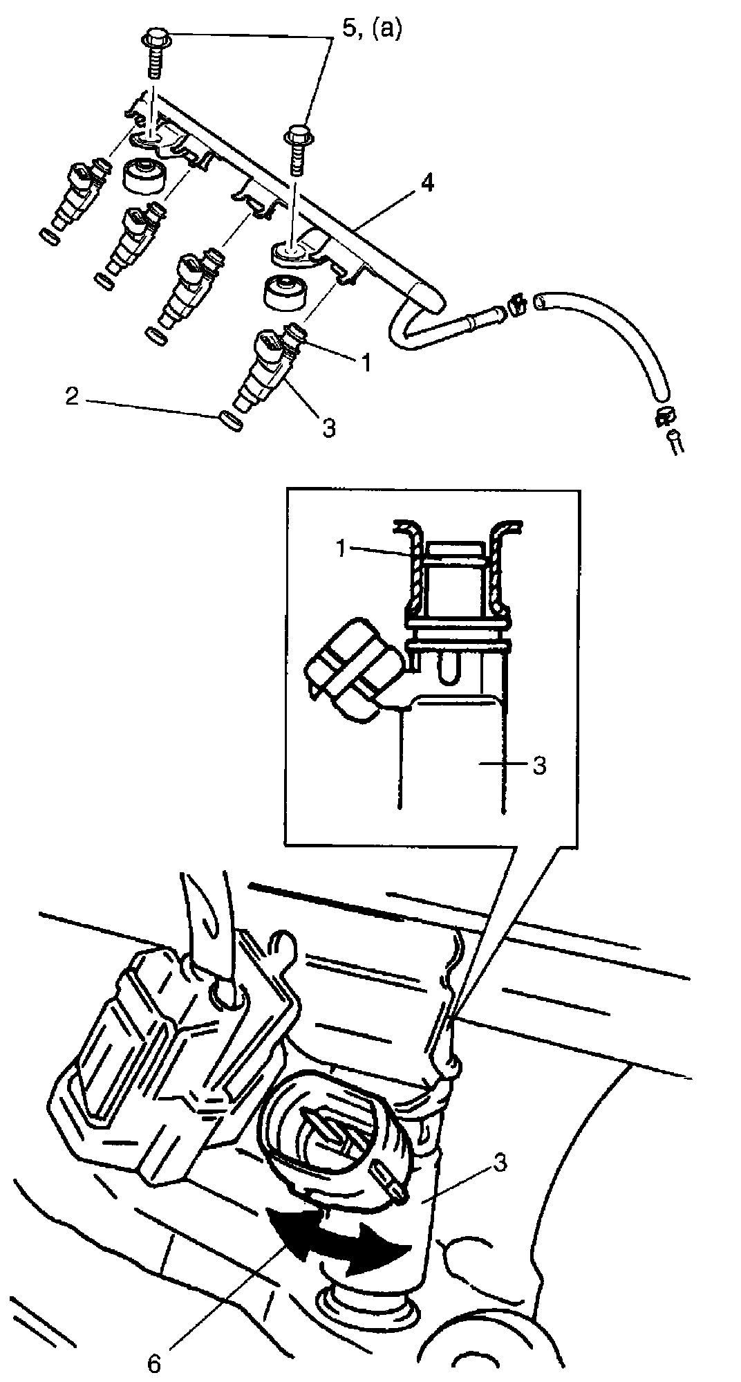 Make sure that injectors rotate smoothly (6). If not, probable cause is incorrect installation of O-ring. Replace O-ring with new one.