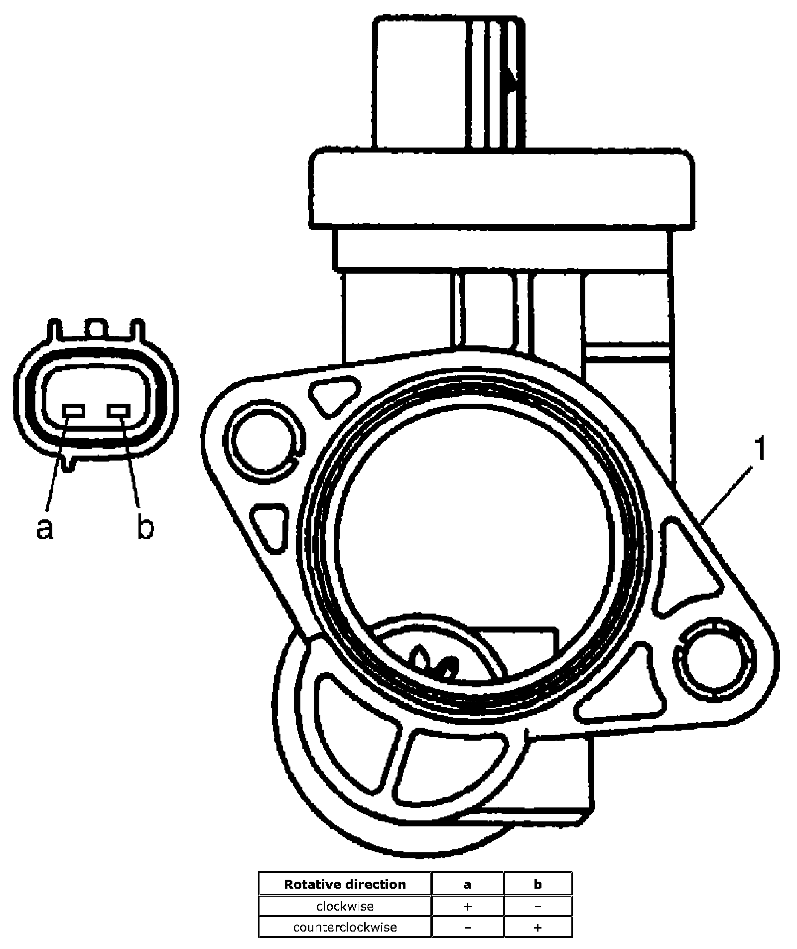 1. Connect battery positive (+) and negative (-) terminals to IMT valve actuator (1) as shown in given table. If it does not operate as specified direction, replace IMT valve actuator.