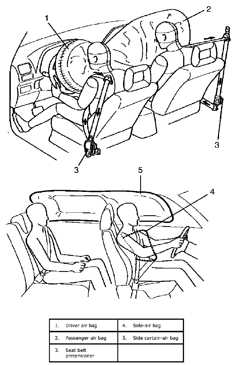 Air Bag System ConstructionWith the air bag system which includes front air bags, side curtain-air bag and side-air bags for both the driver's and passenger's sides as well as the seat belt pretensioners, the sag of the seat belt is taken up (for seat belt with pretensioner), the driver air bag (inflator) module is deployed from the center of the steering column and the passenger air bag (inflator) module from the top of the instrument panel in front of the front passenger seat in occurrence of a front collision with an impact larger than a certain set value to supplement protection offered by the driver and front passenger seat belts.