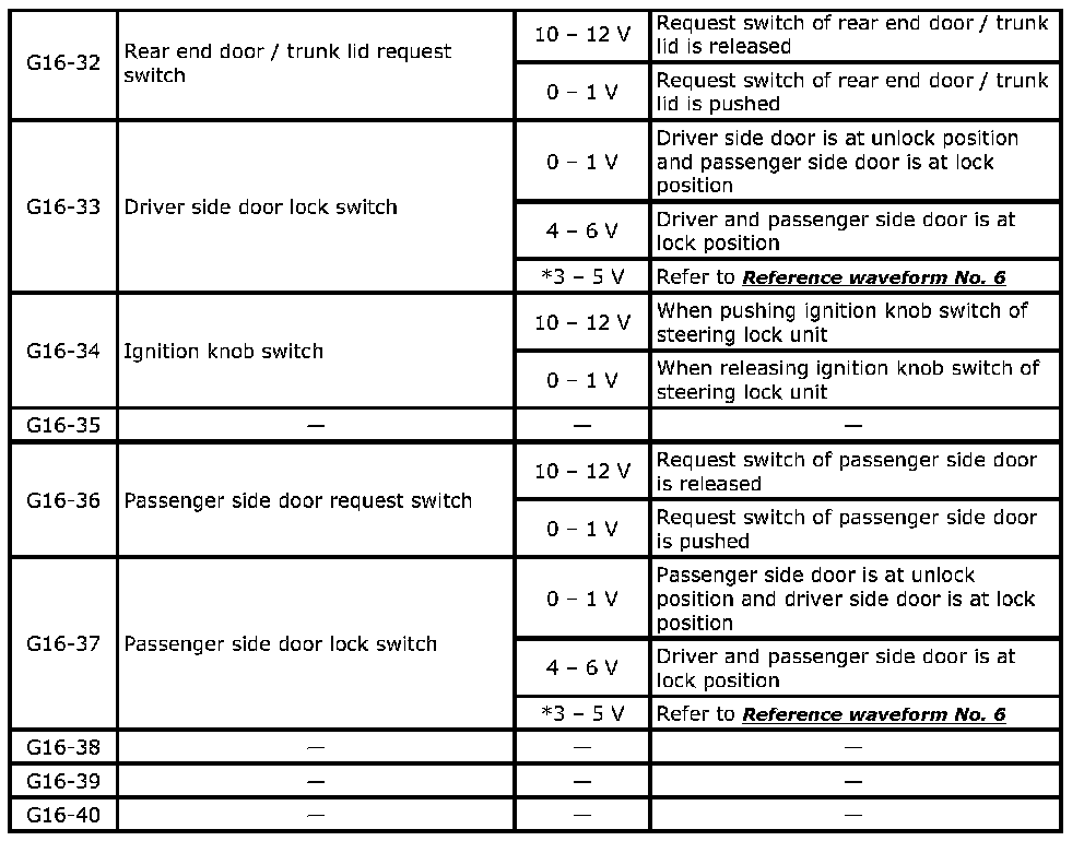 ^ As each terminal voltage is affected by the battery voltage, confirm that it is 11 V or more when ignition switch is ON.