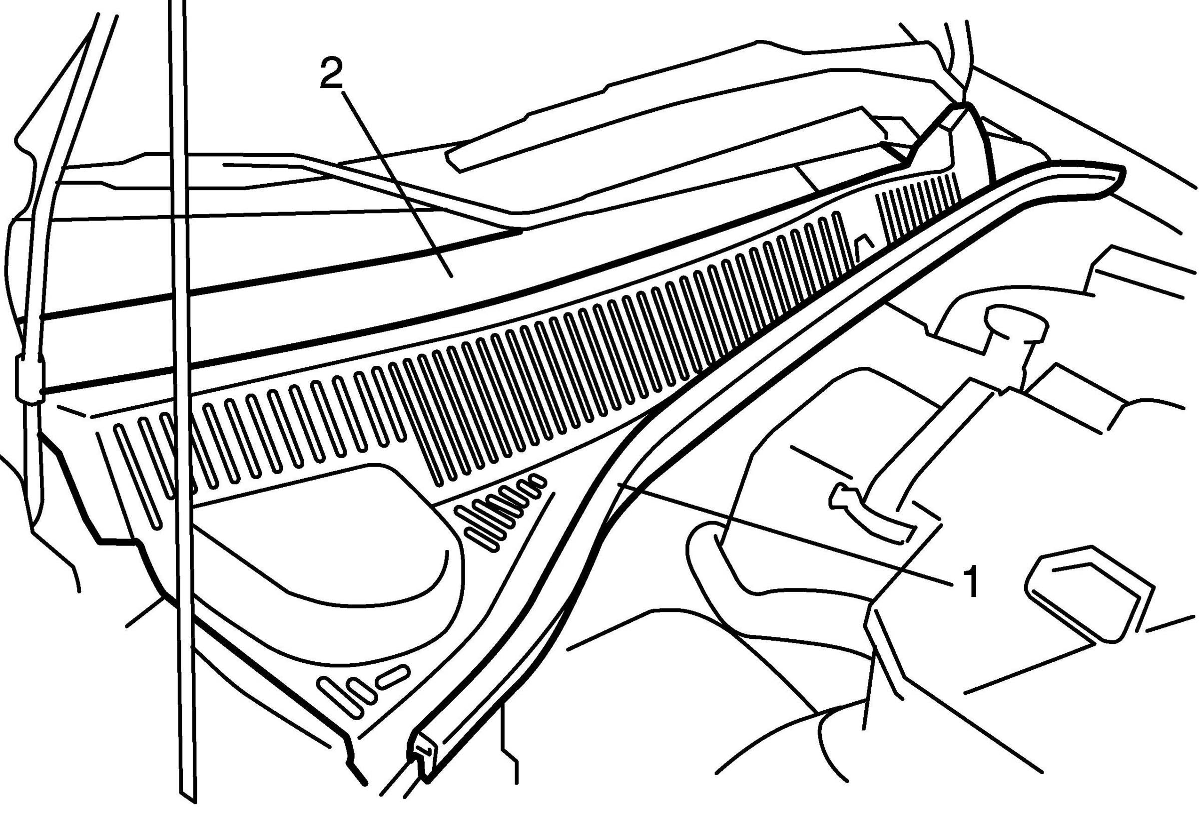 1. Remove hood rear seal (1), and then remove cowl top garnish (2) from vehicle.