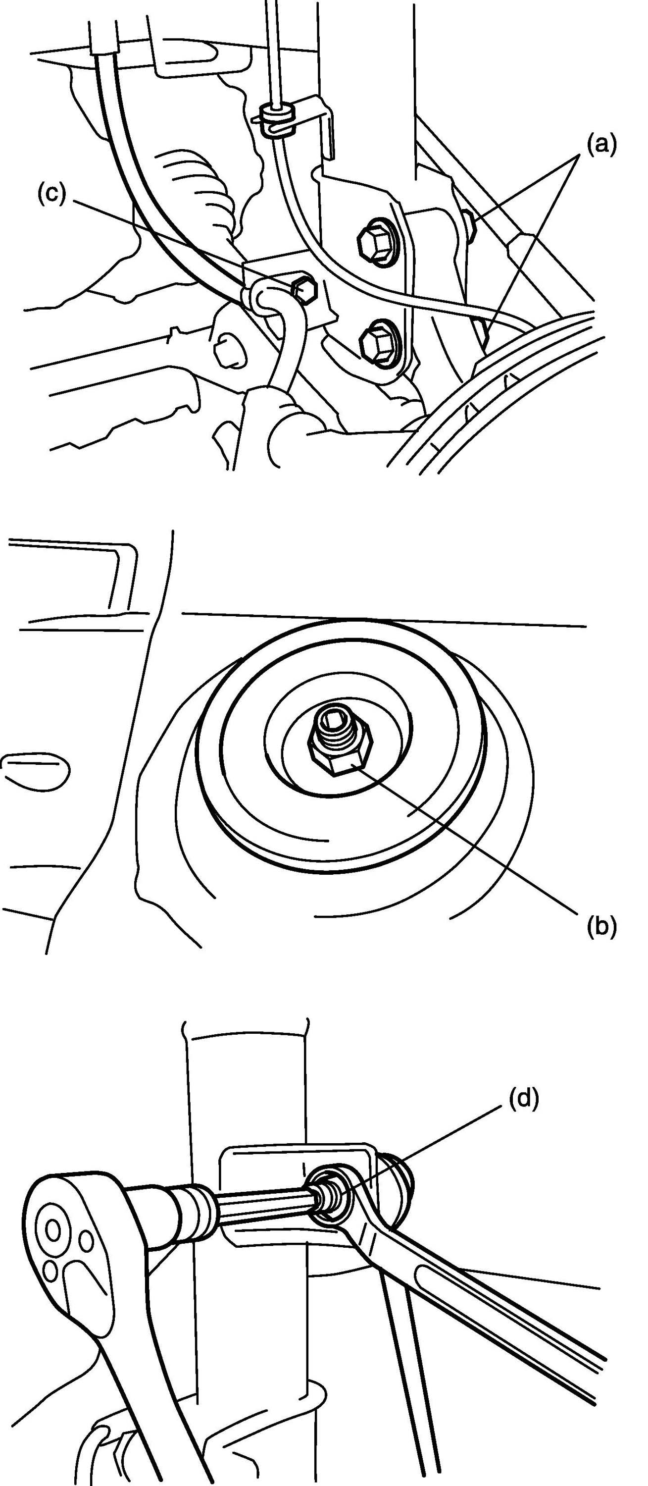 - Lower hoist and vehicle in unloaded condition, tighten strut nut (b) to specified torque.