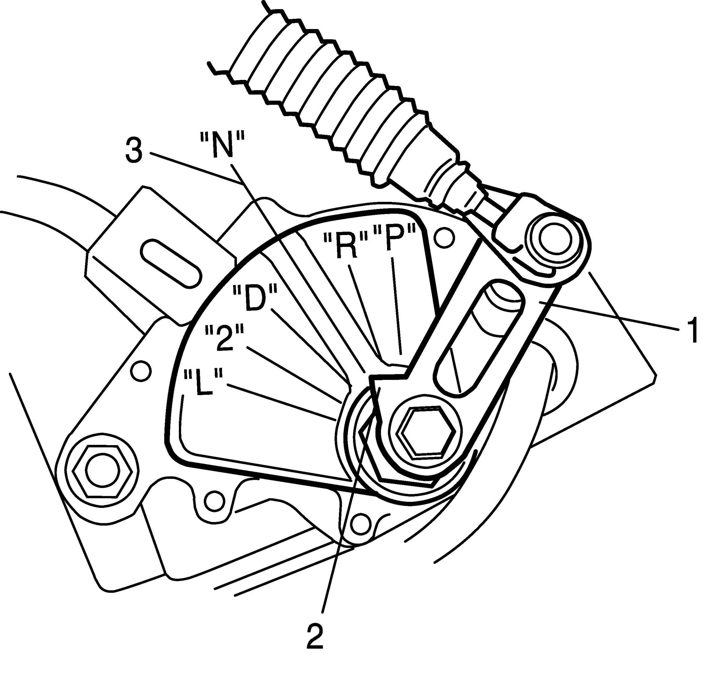 2. Shift manual shift lever (1) to "N" range (transmission range sensor "N" range) aligning arrow (2) of lever (1) with "N" reference line (3).