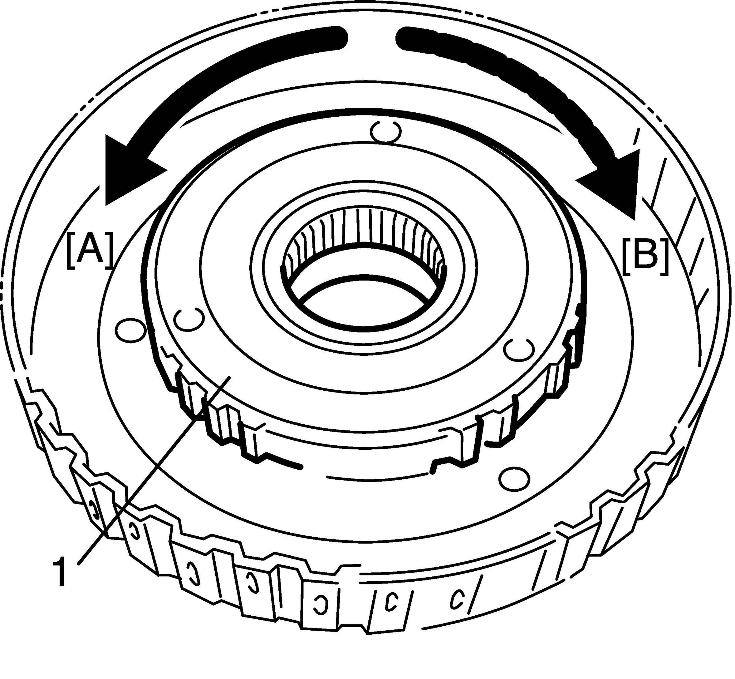4. Check that one-way No. 1 clutch (1) turns freely when turned counterclockwise [A] and looks when turned clockwise [B].