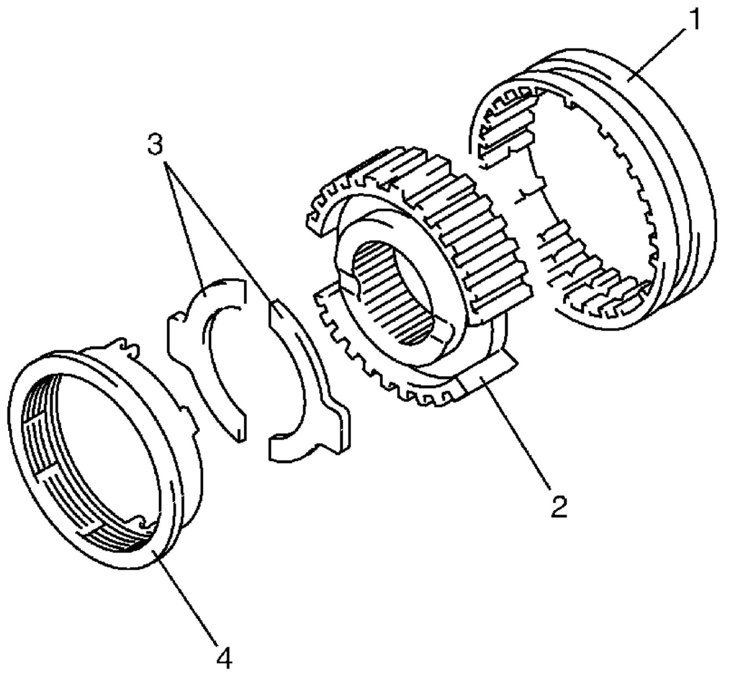 6. Assemble 5th speed synchronizer sleeve (1), hub (2), 5th speed synchronizer levers (3) and synchronizer ring (4) as follows.