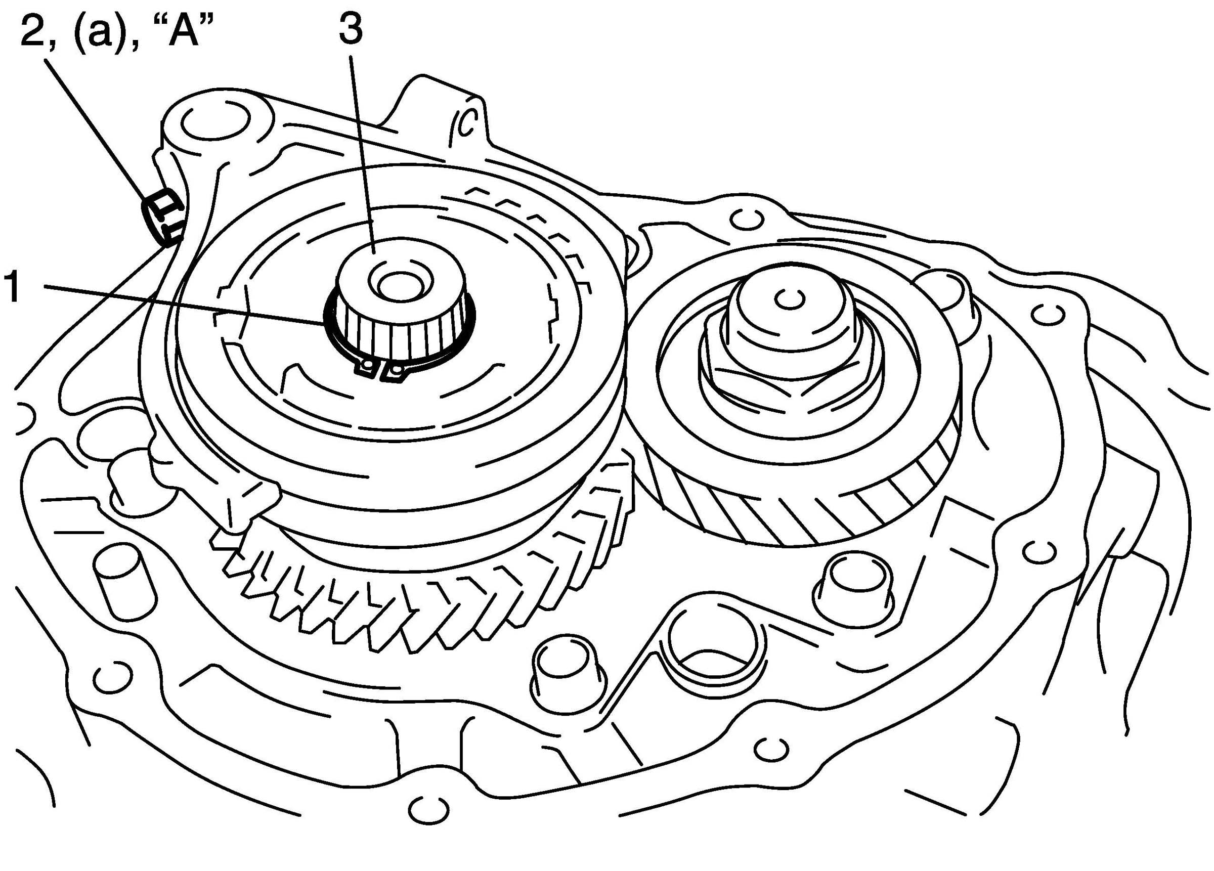 NOTE: Align protrusion "A" of 5th speed synchronizer levers (1) with groove of hub (2).