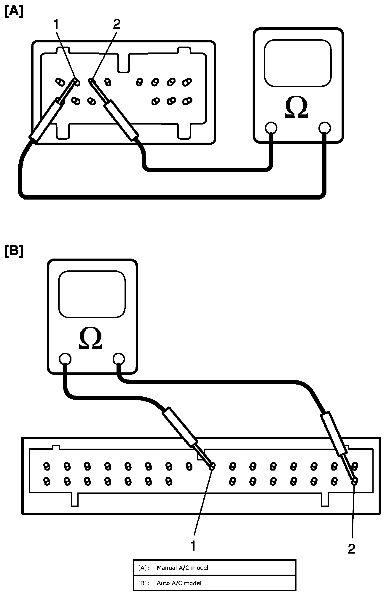 b. Check that there is continuity between terminal (1) and terminal (2) of HVAC control module (unit) when rear end door window defogger switch is at ON position. (Rear end door window defogger switch is kept in push.)